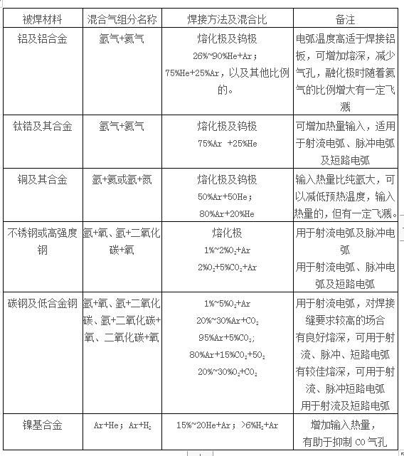 工業(yè)上常用的焊接混合氣大致可能分為二元混合氣、三元混合氣和四元混合氣三類。常用的二元混合氣有Ar-He、Ar-N2、Ar-H2、Ar -O2、Ar-CO2、N2-H2、CO2-O2等;常用的三元混合氣有Ar-He-CO2、Ar-He-N2、Ar-He-O2、Ar-CO2-O2 等;四元混合氣用得比較少,主要由Ar 、He、H2、O2、N2、CO2等配制而成.